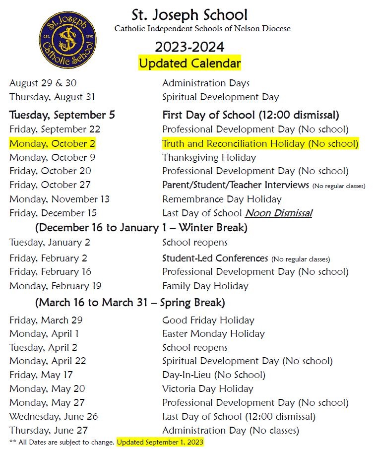 School Calendar Saint Joseph Catholic School